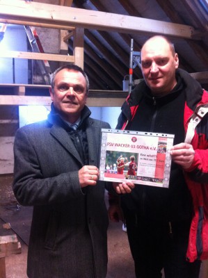 „Natürlich sind wir jetzt nicht übergeschnappt oder größenwahnsinnig geworden.“ lacht Thomas Fiedler, der Vizepräsident des FSV Wacker während des Gesprächs. „Unsere wAcKTIE kann man natürlich nicht an der Börse handeln und das große Geld machen, sie besitzt lediglich einen ideellen Wert.“ Der Begriff wAcKTIE stellt eine Wortkombination aus Wacker und Aktie dar. Sie ist für 103 Euro für jeweils ein Jahr beim Verein zu erwerben. Die drei Euro über den Hunderterbetrag symbolisieren ebenfalls einen Teil des Vereinsnamens. Entstanden ist die Idee aus der Erkenntnis heraus, dass viele Vereine um die Gunst von Spendern und Sponsoren buhlen und man sich schon etwas einfallen lassen muss, um ein „Ja“ oder „Vielleicht“ zu erobern. Darüber hinaus ist es im Gothaer Umland leider Tatsache, dass potente Industrieunternehmen ihre Verbundenheit mit dem Standort Gotha kaum dokumentieren. Als Begründung für ein Nichtengagement wird dann meist angeführt, dass sich der Stammsitz der Firma schließlich woanders befindet. Versucht man dort Kontakt zu bekommen, naja, aus deren Sicht ist Gotha weit weg und unbedeutend. Bleibt also der Weg über die vielen kleinen Unternehmen im Gothaer Umfeld, die natürlich nicht nur von unserem Fußballverein auf Spenden angesprochen werden. „Also lag die Schlussfolgerung nah: wir müssen um kleine, wiederkehrende Spenden bitten, um Beträge, die nicht wehtun. Außerdem wollen wir dem Unternehmen neben der reinen Erwähnung als Förderer oder Spender hinaus einen möglichst pfiffigen Gegenwert bieten. Mit dieser Pseudoaktie ist uns das ganz gut gelungen, denn egal ob der Firmeninhaber sich die wAcKTIE sichtbar hinter seinem Schreibtisch anbringt oder ob er sie an einen wertvollen Mitarbeiter seines Hauses weiter gibt, von dem er weiß, dass dieser ein Fußballfreund ist, es ist damit nicht nur einfach ein Geldschein von einer Hand in eine andere gewandert.“