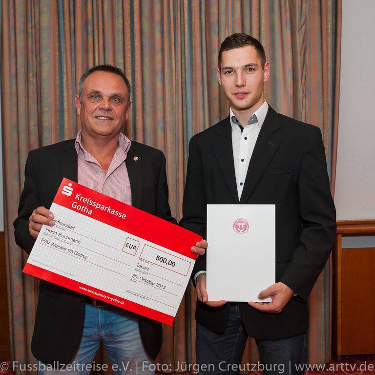 Dr. Wolfhardt Tomaschewski, Präsident des Thüringer Fußball-Verbandes (TFV), eröffnete mit Vertretern des Vereins „Fussballzeitreise“ den gemeinsam veranstalteten Abend mit einer Führung durch die vom Tabarzer Marcel Wedow über Jahre aufgebaute Ausstellung. Der mit 1500 Euro dotierte Preis wurde anschließend durch ihn und die Vorsitzende des Vereins Fussballzeitreise e.V. Christina Dietzel im Hotel Zur Post an drei junge und engagierte Thüringer Sportfreunde, unter anderem an unseren Horst Bachmann überreicht. 25 Bewerbungen lagen aus ganz Thüringen vor.