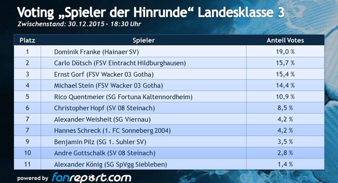 Nur noch bis zum 2. Januar wird über die Internetplattform www.fanreport.com der Spieler der Hinrunde in der Landesklassen-Staffel 3 gewählt. Mit und wie man dem Screenshot entnehmen kann ganz vorn dabei sind unsere beiden Wackeren Ernst Gorf und Michael Stein. Zwei Gothaer Sportler, zwei hervorragende Fußballer und darüber hinaus zwei überaus sympathische Jungs.