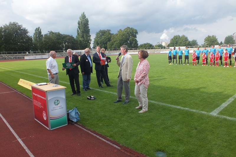 Der Verein hatte dieses Highlight gut vorbereitet, die C-Junioren symbolisierten die 16 Mannschaften der Landesliga, Hartmut Gerlach vom TFV fungierte als Moderator und stellte alle Mannschaften vor.