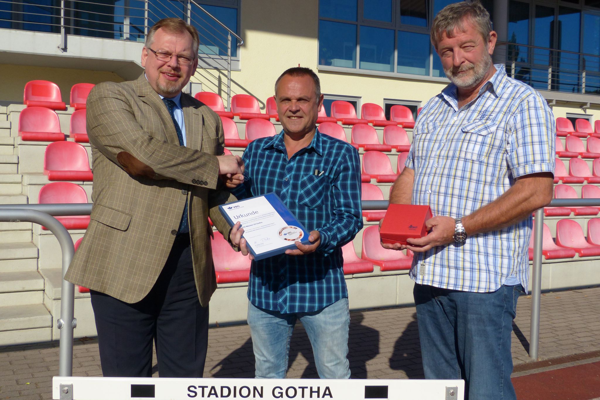 Vereinspräsident Thomas Fiedler durfte vom Leiter des Bereichs Prävention der VBG, Dipl.-Wirtschaftsingenieur Claas Korriess (links im Bild) und der Aufsichtsperson für den Bereich Prävention der VBG Bezirksverwaltung Erfurt, Herrn Dipl-Ing. (FH) Hans-Jörg Becker (rechts) die Glückwünsche und Preise entgegennehmen.