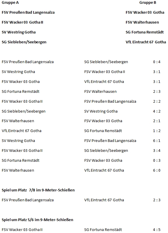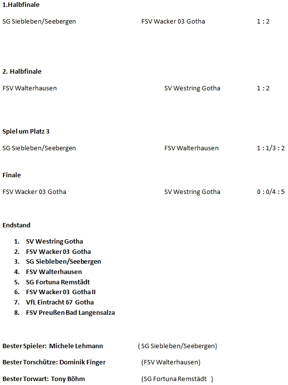 Gespielt wurde zunächst in 2 Vorrunden mit anschließenden k.o. Spielen. Der Pokalverteidiger FSV Waltershausen konnte zwar die Vorrunde ungeschlagen beenden, im Halbfinale aber war gegen Westring Gotha Schluss. Im Finale spielten dann der Gastgeber Wacker mit seiner ersten Mannschaft gegen Westring und alle gingen von einem Sieg von Wacker aus, aber es konnte wieder einmal der Beweis angetreten werden, dass solche Spiele ihre eigenen Gesetze haben, denn Sieger und Pokalgewinner wurde, wenn auch erst nach 9-Meter-Schießen, die Mannschaft des SV Westring Gotha.