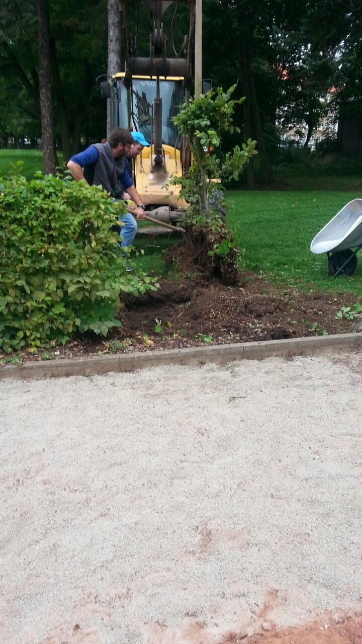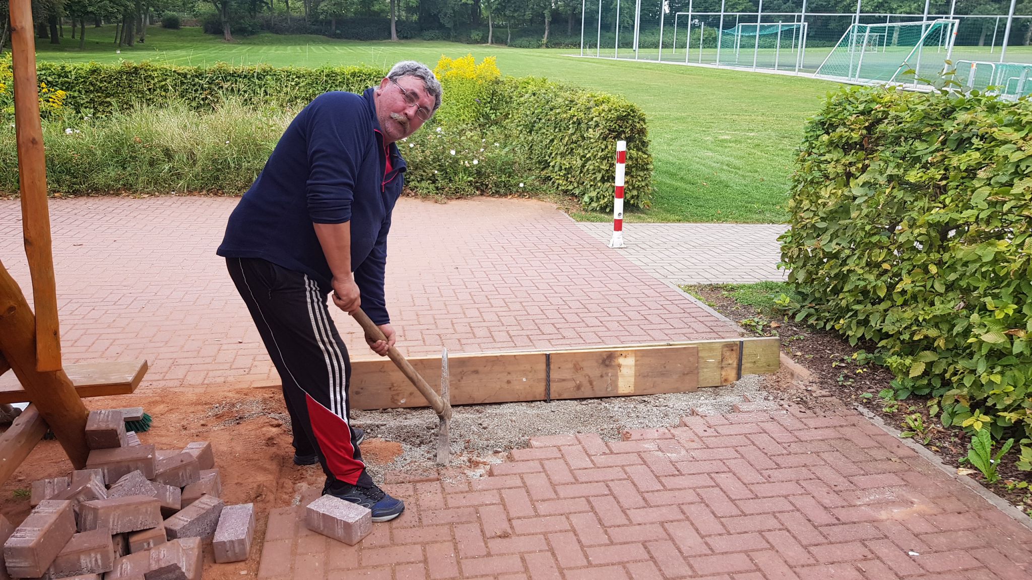 Nun hat unser Verein das gewaltige Paket der zu erbringenden Eigenleistungen mit einem zünftigen Arbeitseinsatz am heutigen Tage in Angriff genommen. Die Hainbuchenhecke wurde entfernt und das Betonsteinpflaster aufgenommen. Somit konnten wir Baufreiheit für die bald anstehenden Gründungsarbeiten des neu zu errichtenden Ostflügels schaffen. Zuvor hatten bereits einige Sportfreunde die östliche Giebelwand von der alten Styropordämmung befreit.