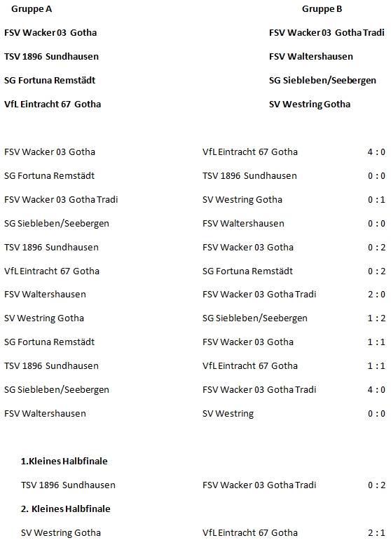 Austragungsort war diesmal die Sporthalle der Herzog-Ernst-Schule. Der Seniorenbeirat des FSV Wacker 03 Gotha unter Leitung von Karl-Heinz Sauerbrey hatte dieses Turnier wie immer akribisch vorbereitet und insgesamt acht Mannschaften aus dem Kreis Gotha eingeladen, die von der Kreisklasse bis zur Verbandsliga aktiv sind. Ausnahme bildete eine Traditionsmannschaft des gastgebenden Vereines, die mit zahlreichen ehemaligen aktiven Spielern angetreten war.