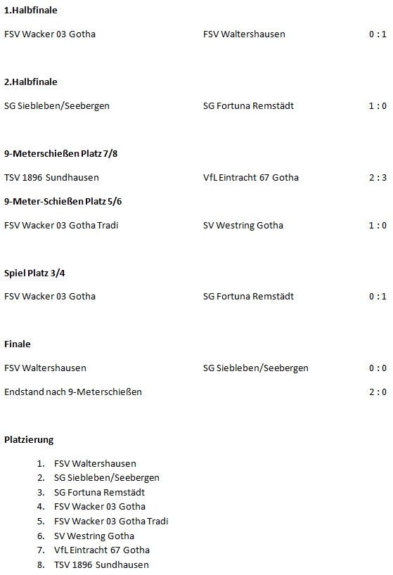 Den Pokal gewann in diesem Jahr die Mannschaft vom FSV Waltershausen und wurde wie auch in den Vorjahren von Uwe Baumbach, dem Sohn von Raftl Baumbach, übergeben.