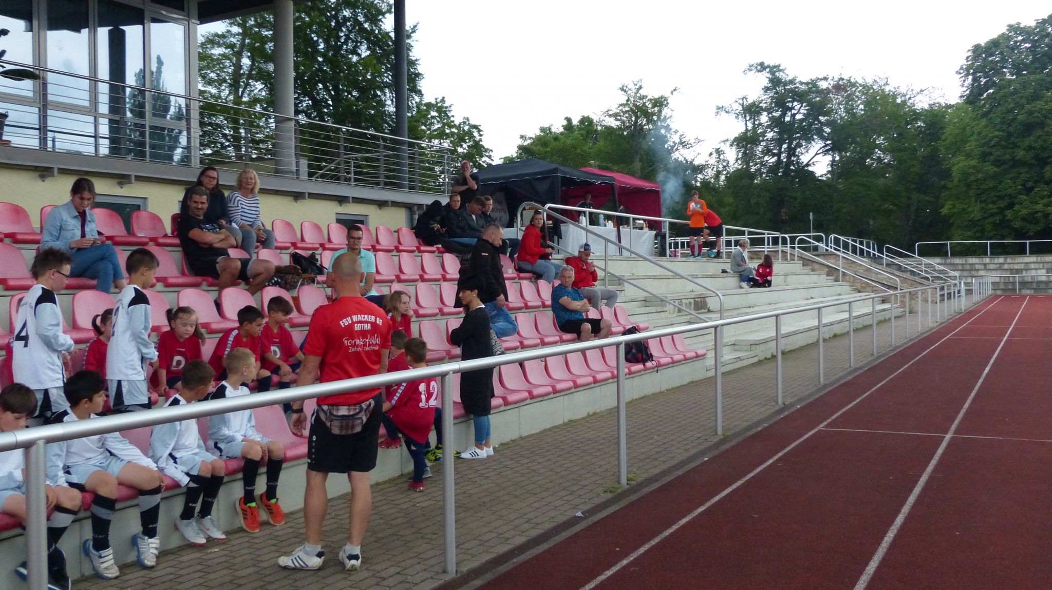 Mit einer vom Förderverein des FSV Wacker 03 Gotha hervorragend organisierten Versorgung der knapp 200 Zuschauer gab es zum ersten Mal seit langer Zeit wieder eine Doppelveranstaltung im Volkspark-Stadion. Bereits in den Vormittagsstunden hatte unser Förderverein sein in den Vereinsfarben angelegtes schwarz-rotes Versorgungszelt aufgebaut.