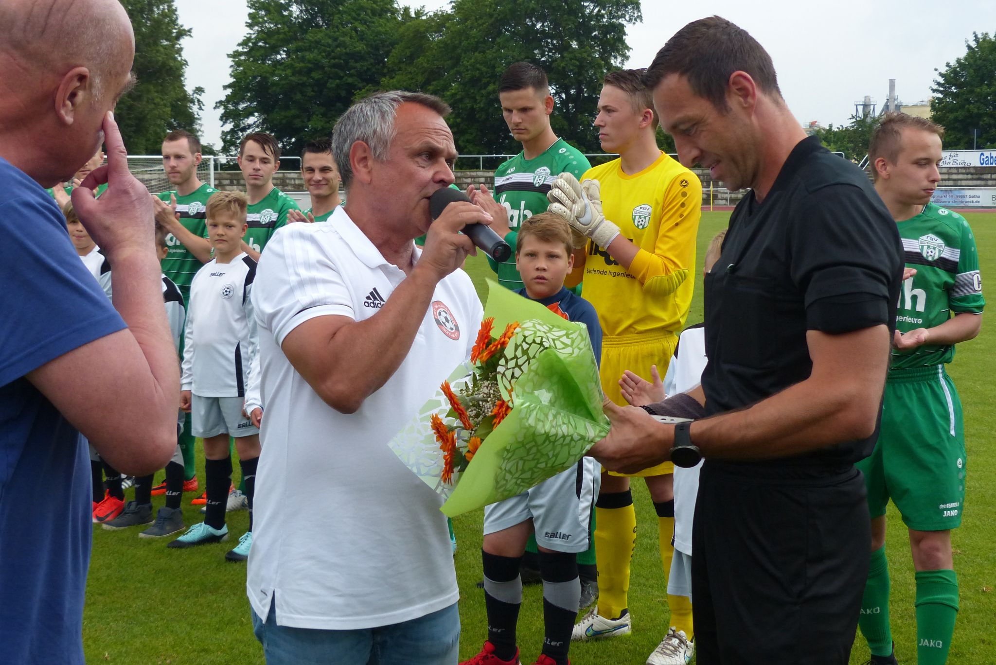 Bevor Schiedsrichter Patrick Hofmann von Präsident Thomas Fiedler für seinen letzten Auftritt als Unparteiischer im TFV-Maßstab geehrt wurde, galt es in einem emotionalen Zeremoniell, verdiente Trainer unseres FSV zu verabschieden.