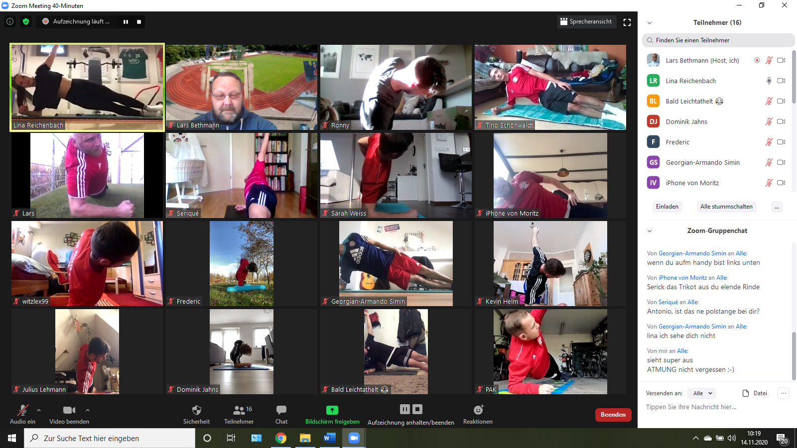 Unsere 1. Männer hat heute eine Stunde gemeinsam trainiert. Unter diesen Umständen trafen wir uns im viertuellen Chat und absolvierten eine Trainingseinheit, die unsere Physiotherapeutin Lina leitete. Es war schön gemeinsam zu trainieren und hat allen nicht nur Schweiß gebracht. Gemeinsam ist eben doch am schönnsten. Wacker voran