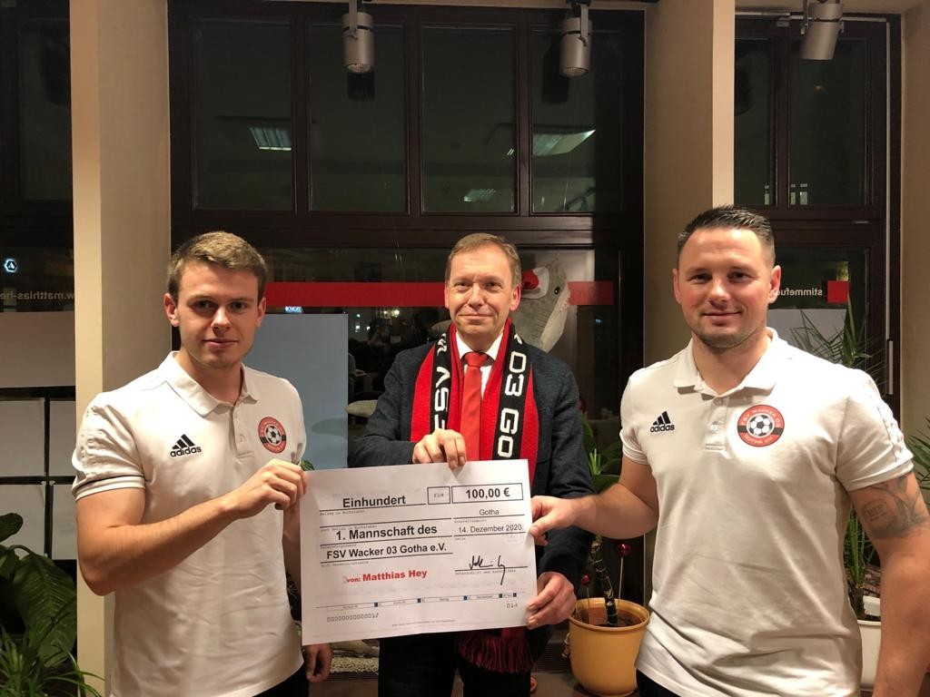 Matthias Hey übergab den zugehörigen Scheck gestern an Kapitän Franz Burkhardt und Christian Hatzky - der FSV Wacker 03 Gotha sagt DANKE!!!