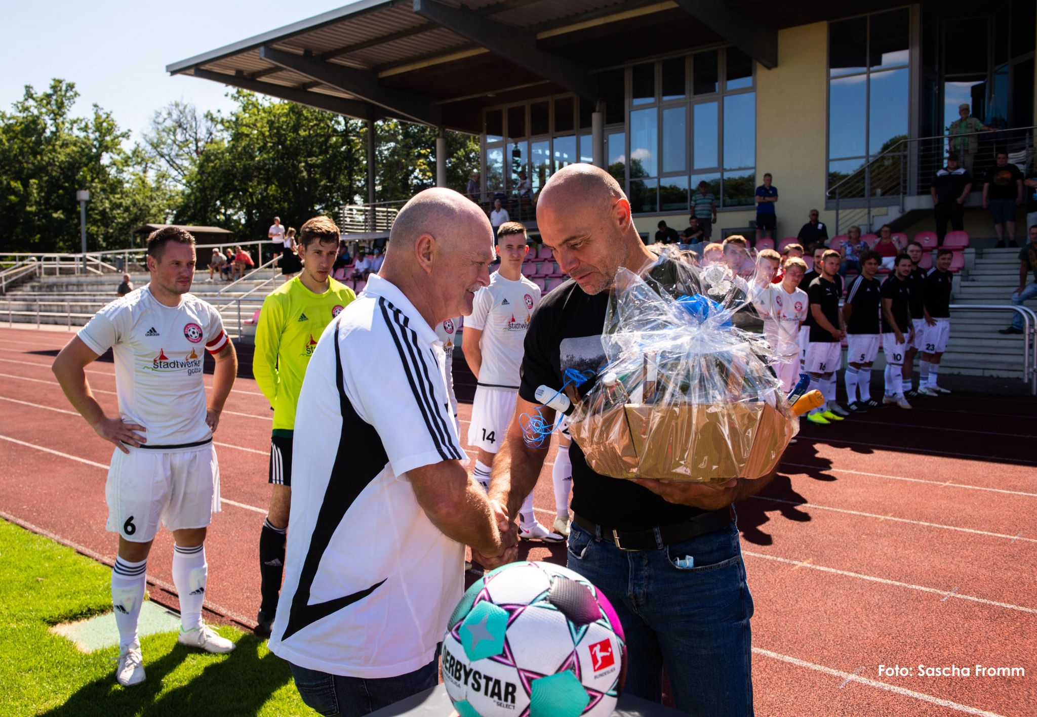 Zuerst überreichte Holger Bühner, Cheftrainer von 2004 bis 2013 auch im Namen des ehemaligen Präsidenten Holger Gabe einen wunderschönen Präsentkorb.