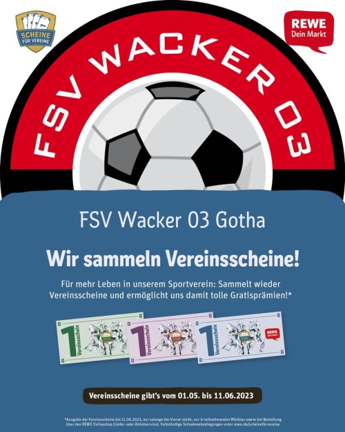 In der Zeit können wir wieder fleißig für unseren FSV sammeln: Pro 15 € Einkaufswert in den teilnehmenden REWE-Märkten erhaltet ihr einen Vereins-Schein. Diesen Schein könnt ihr dann auf der unten aufgeführten Internetseite idealerweise dem FSV Wacker 03 Gotha e. V. 😉 zuordnen.