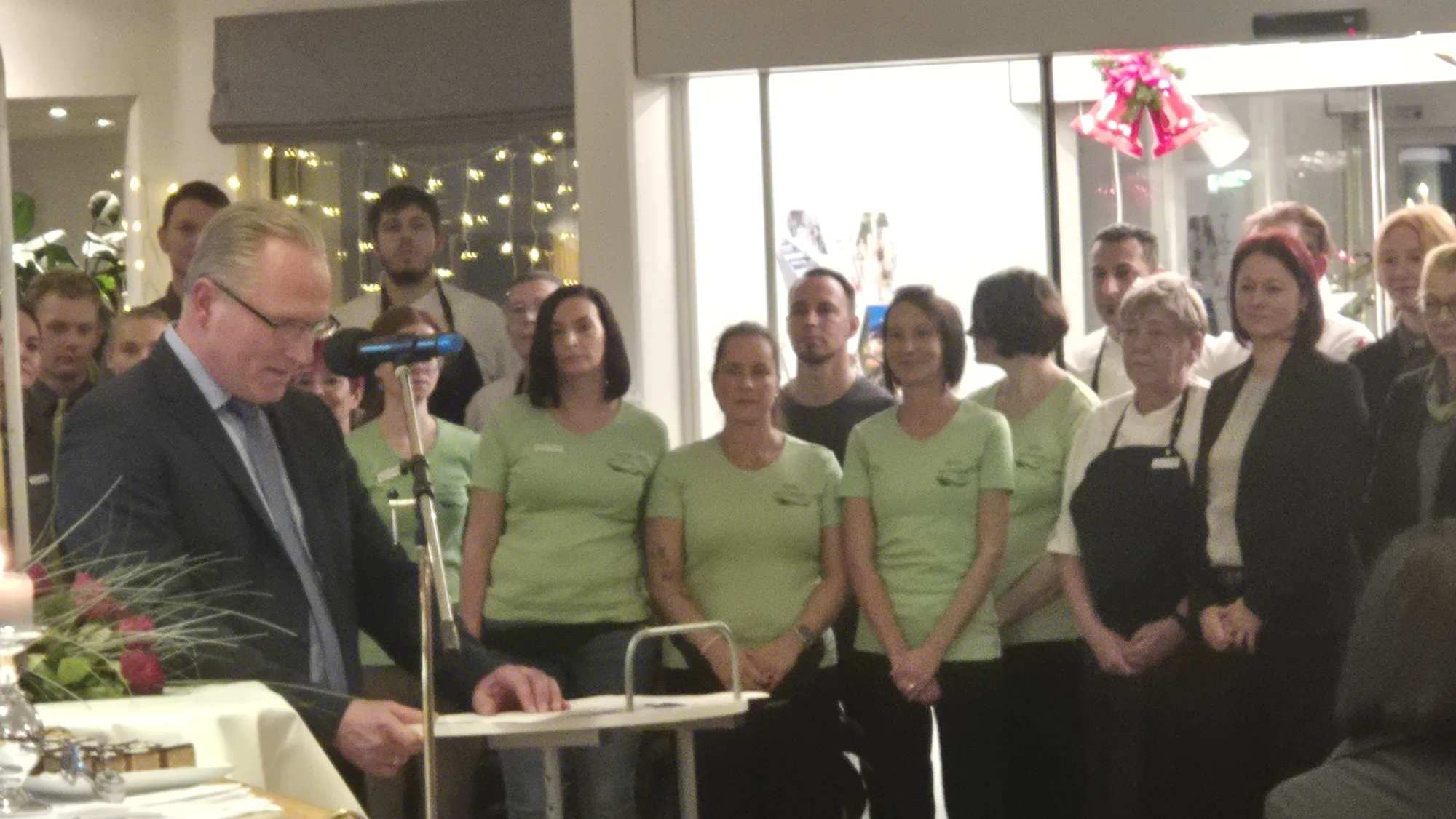 zu gratulieren. Besonders bewegend war der Moment, als nach einer würdigen Rede des Geschäftsführers Reiner Lutz alle im Hause angestellten Mitarbeiter Einzug hielten und jeweils eine Rose an die Jubilarin überreichten. 14 Männer und 17 Frauen, aus vier Nationen stammend, nahmen sich diesen kurzen Moment der Auszeit, um ihrer Chefin zu gratulieren. Gleich danach verschwanden alle wieder an ihren Arbeitsplätzen, um den anwesenden Gästen ein phänomenales Buffett zu kredenzen.